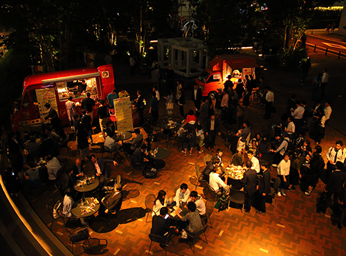 オープニングは「和桜花」のパフォーマンスから!「東村山西宿囃子保存会」による祭囃子も続いて、雰囲気はまさに夏祭り!射的、ヨーヨー釣り、お祭り屋台も登場!懐かしくも新しい、オフィス街の美味しい夏祭りを味わってください!